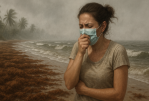 Quienes viven o trabajan cerca del sargazo ya sienten molestias físicas frecuentes y difíciles de ignorar. Entre los síntomas comunes están garganta seca, picazón nasal y sensación de polvo persistente al respirar. También hay tos seca, que empeora al amanecer y en la tarde, casi como si fuera rutina. Algunos tienen ojos irritados, dolor de cabeza, presión en el pecho y dificultad para respirar normalmente. Personas con problemas respiratorios previos sufren más; para ellos, estar allí es una batalla diaria.